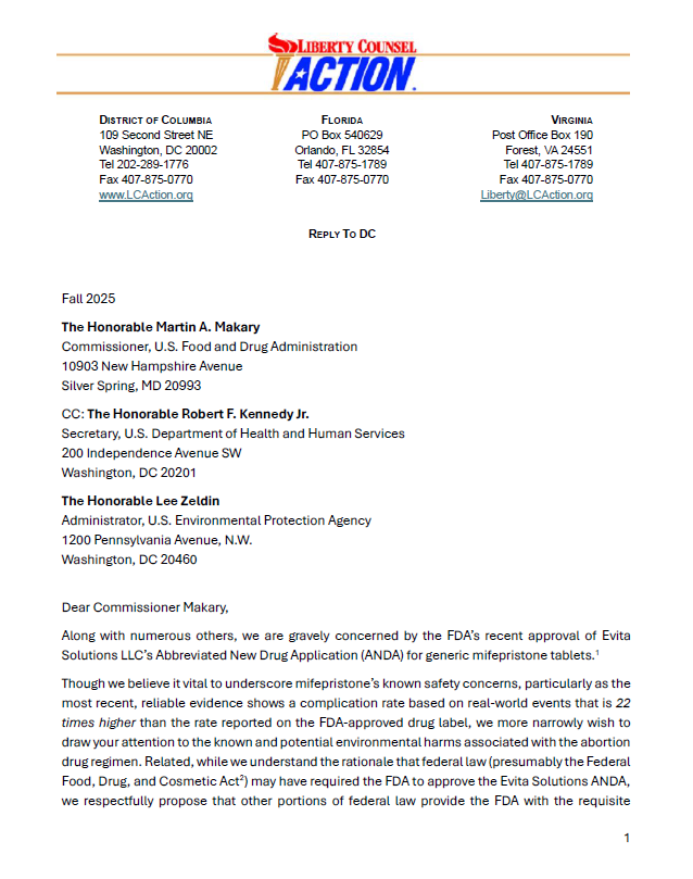 Founded in 1986, Liberty Counsel Action is a law and policy education, training and advocacy organization. From offices in Washington, DC and Orlando, Florida, LCA advances religious freedom, the sanctity of human life, the family, responsible government, national security, and support for Israel at the federal, state, and local levels. All contributions are made with the understanding that this ministry has complete discretion and control over use of donated funds. If the project described is fully funded, delayed or canceled, excess funds will be committed to the need most closely identified with the purpose for which the funds were originally given. Liberty Counsel Action is a 501(c)(4) tax-exempt nonprofit organization. Donations are not tax deductible. Abortion in Our Water