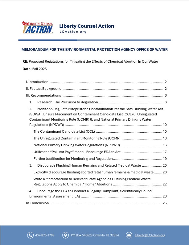 Founded in 1986, Liberty Counsel Action is a law and policy education, training and advocacy organization. From offices in Washington, DC and Orlando, Florida, LCA advances religious freedom, the sanctity of human life, the family, responsible government, national security, and support for Israel at the federal, state, and local levels. All contributions are made with the understanding that this ministry has complete discretion and control over use of donated funds. If the project described is fully funded, delayed or canceled, excess funds will be committed to the need most closely identified with the purpose for which the funds were originally given. Liberty Counsel Action is a 501(c)(4) tax-exempt nonprofit organization. Donations are not tax deductible. Abortion in Our Water