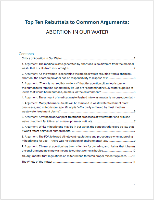 The white paper, entitled “Abortion in Our Water, A Special Report: Chemical Home Abortions & the Disposition of Aborted Fetal Remains,” provides a comprehensive analysis regarding the environmental impact of the abortion pill (Mifepristone) and human fetal remains entering our water systems. Drawing from various studies and peer-reviewed research, petitions to the EPA, government documents, interviews with water treatment experts, and proprietary modeling, the report estimates that approximately 700,000 chemical abortions occur per year.