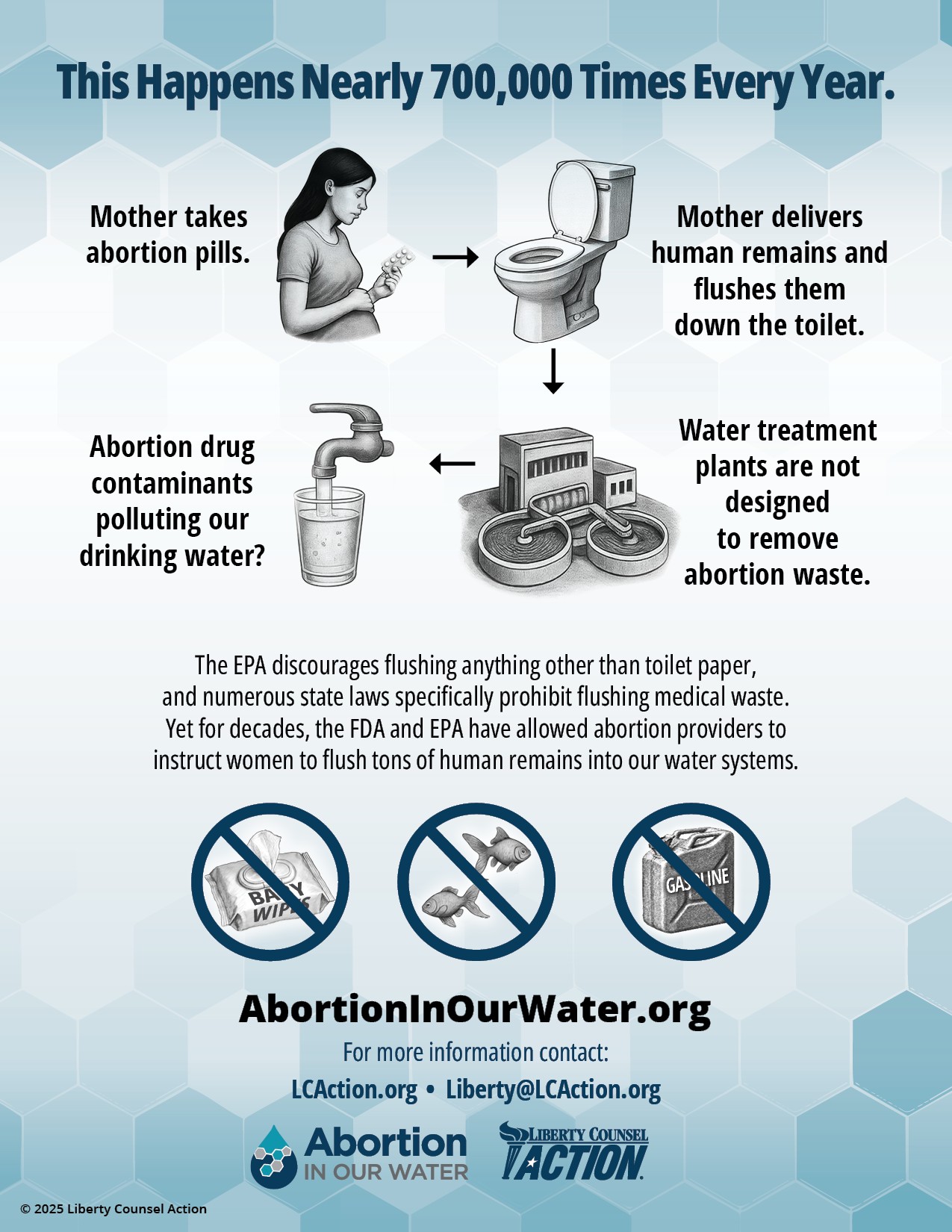 Founded in 1986, Liberty Counsel Action is a law and policy education, training and advocacy organization. From offices in Washington, DC and Orlando, Florida, LCA advances religious freedom, the sanctity of human life, the family, responsible government, national security, and support for Israel at the federal, state, and local levels. All contributions are made with the understanding that this ministry has complete discretion and control over use of donated funds. If the project described is fully funded, delayed or canceled, excess funds will be committed to the need most closely identified with the purpose for which the funds were originally given. Liberty Counsel Action is a 501(c)(4) tax-exempt nonprofit organization. Donations are not tax deductible. Abortion in Our Water
